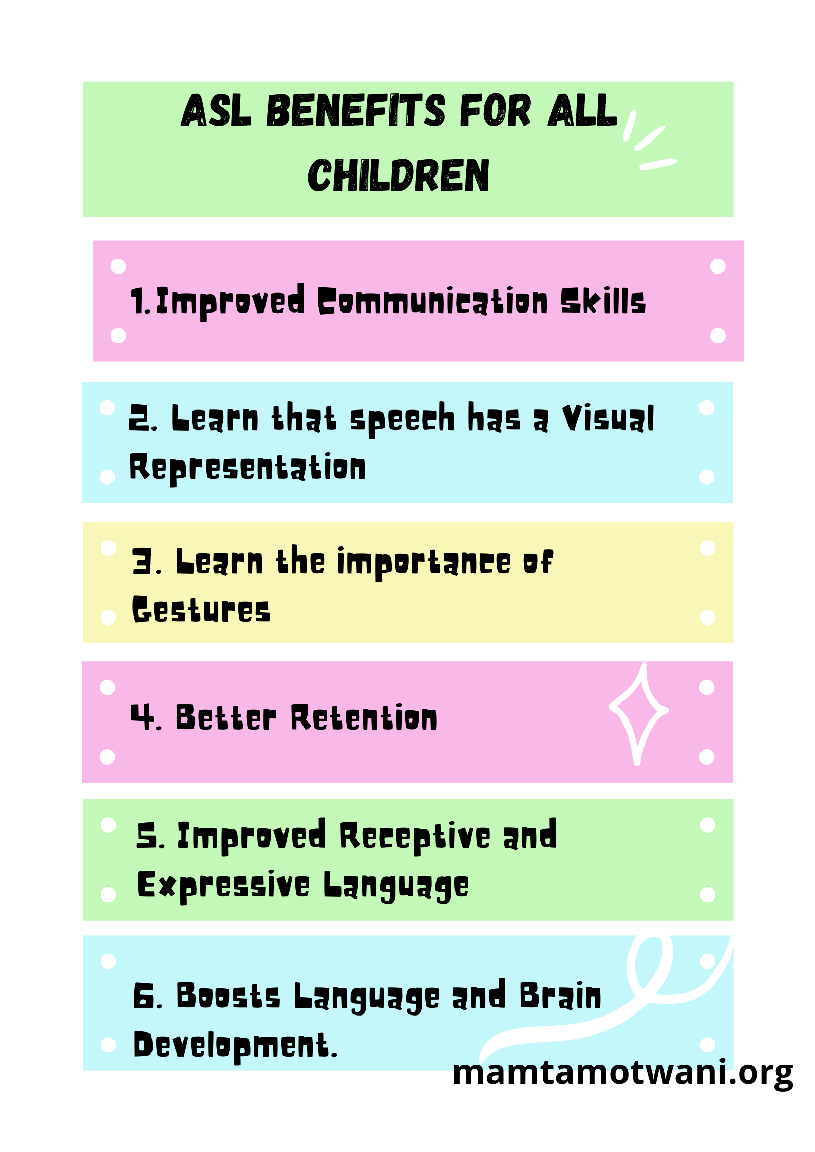 Research has proved that the use of sign language has led to improvement in communication skills in children with cognitive disabilities, language disorders, and autism. Children learn from a very young age that speech has a visual representation. It teaches children the importance of using gestures. Some children learn better what they hear while some learn better when they see. Adding movements and gestures helps the children to retain better enhancing their receptive and expressive language. ASL not only supports and boosts our language development but also brain development.